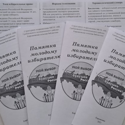 Выборы занимают важное место в политической жизни Российского государства.Участие в выборах — это показатель гражданской зрелости и самостоятельной политической позиции, готовность к тому, чтобы, принимая участие в избирательном процессе, взять на себя ответственность за формирование власти. Сделать правильный выбор — это всегда ответственность, грядущие перемены, надежда на достойное будущее. В период подготовки к выборам, которые состоятся 10 сентября 2023 года библиотекарь Кирсановской сельской библиотеки 17 августа провела акцию «Мой выбор – будущее России!», молодым жителям с. Кирсановка были вручены памятки молодому избирателю. В памятке была изложена информация об избирательном праве, о порядке голосования, терминологический словарь. |