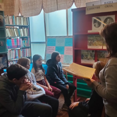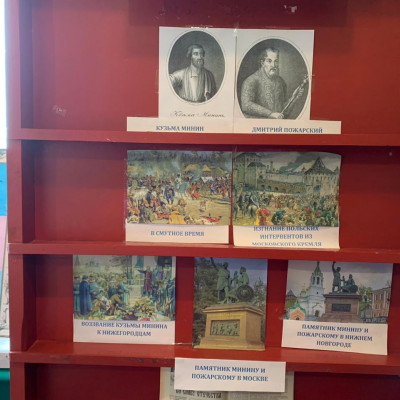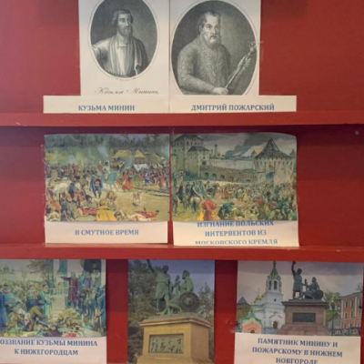 Беседа- историческая лекция была проведена около стенда посвященного освобождению Москвы от польских интервентов под предводительством Кузьмы Минина и Дмитрия Пожарского. На стенде предоставлены фотографии картин самих предводителей Минина и Пожарского, картин «В смутное время», « Изгнание польских интервентов из московского Кремля» и « Воззвание Кузьмы Минина к Нижегородцам», а также фотографии памятников Минину и Пожарскому в Москве и Нижнем Новгороде.